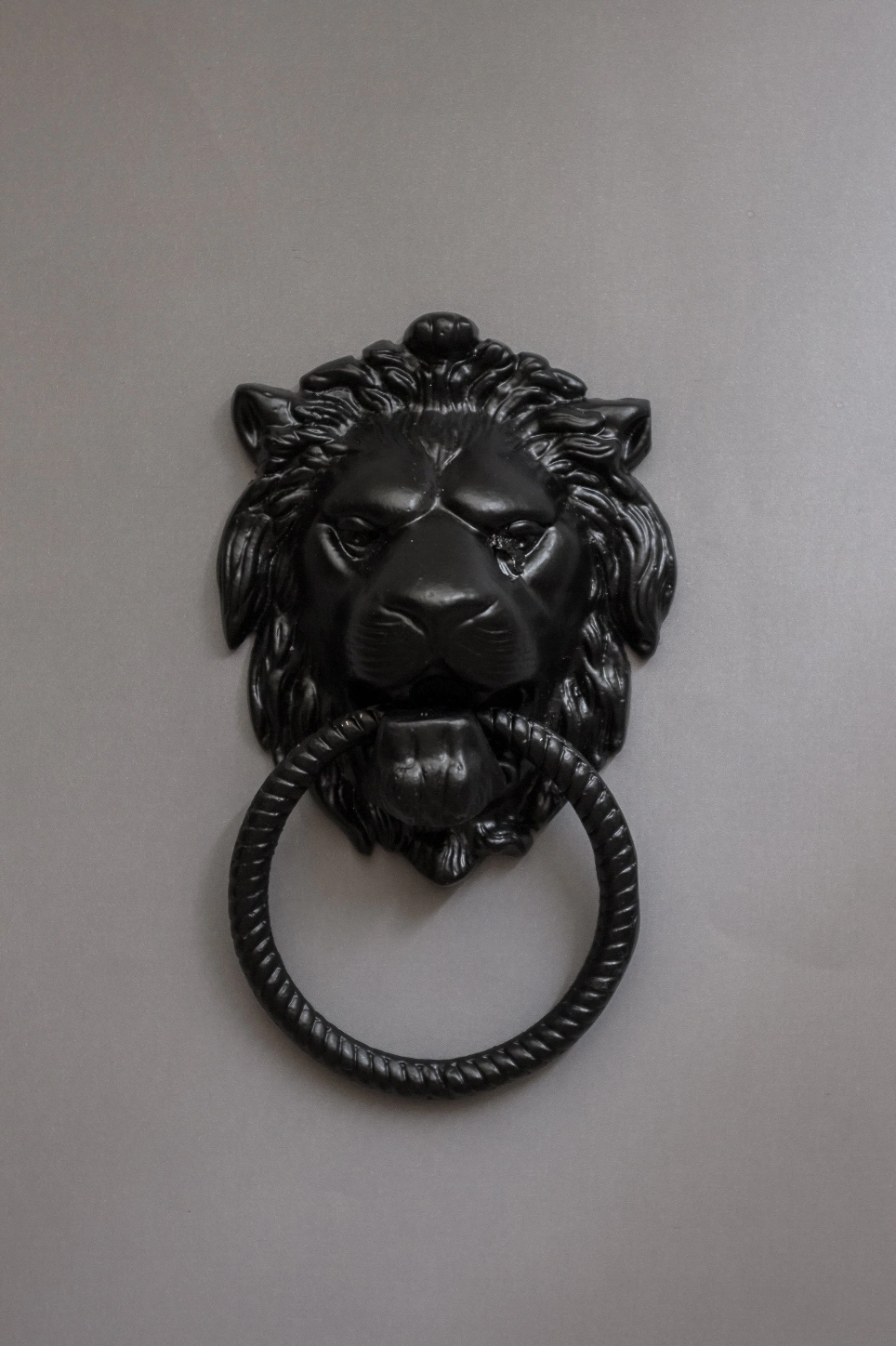 Llamador león fabricado en bronce color negro mateMedidas:Alto total: 18 cmAncho: 10.5 cmDiámetro del aro: 9,5 cm