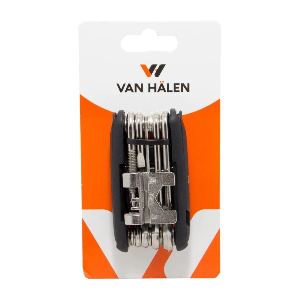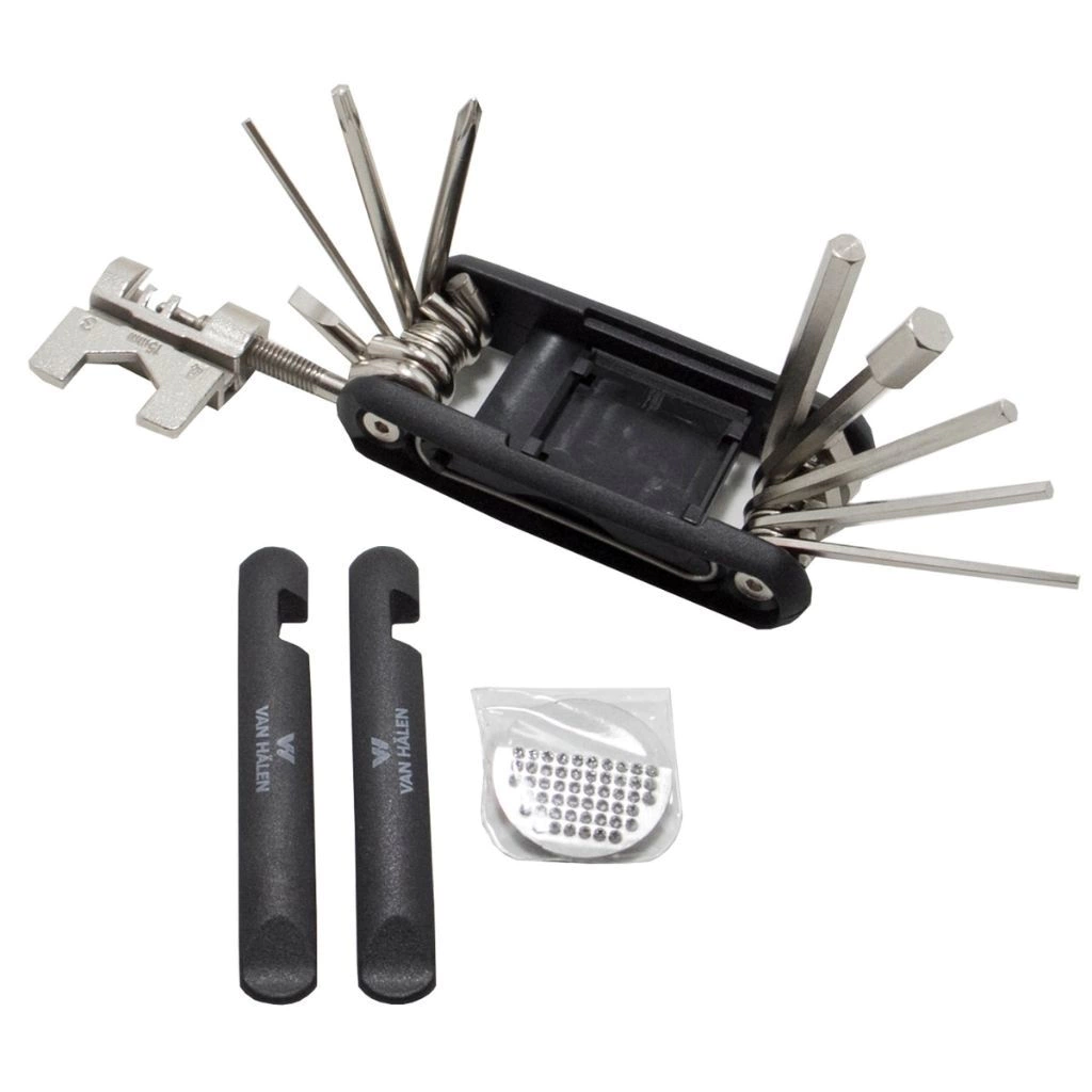 Set Multi Herramientas Van Halen 14 en 1Material AceroMedida 9x4.5x2cmLlave alen -2-2.5-3-4-5-6-8mmDestornillador punta planaDestornillador phillipsDestornillador torxCorta cadena 2 llaves sacacubiertas4 parches