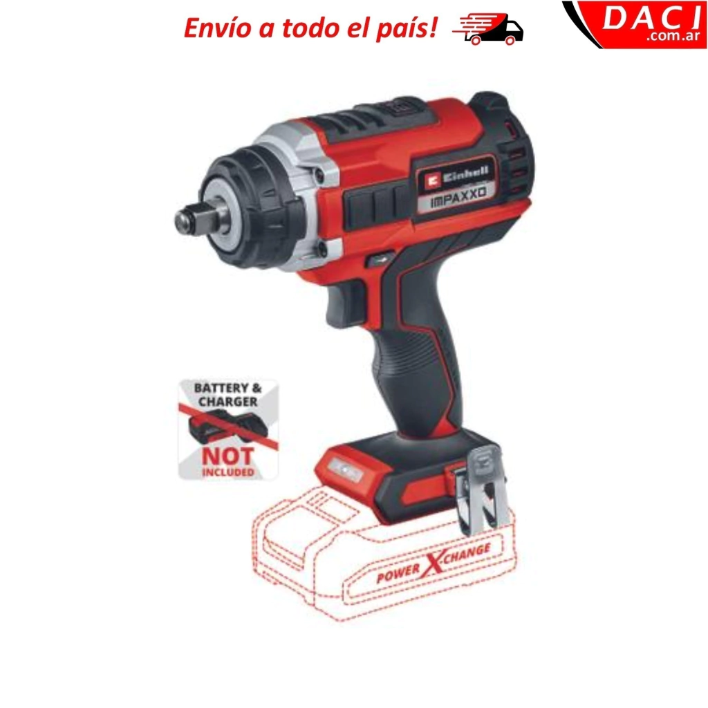 Llave de impacto inalámbrico IMPAXXO 18/400 - EinhellUn miembro de la familia Power X-ChangeMotor sin carbones: más potencia y más tiempo de funcionamientoMotor sin carbones: más potencia y funcionamiento prolongadoLlave de impacto sin cable de gran potencia y alto parRobusta montura cuadrada externa de 1/2".Completa con lámpara LED para iluminar el área de trabajo3 velocidades para un ajuste perfecto de la potencia y la velocidadSe completa con un adaptador de puntas para atornillarCompleta con un juego de tuercas para el cambio de ruedas de cochesSe suministra sin batería ni cargador (disponibles por separado)Descripcion del articuloLa llave de impacto inalámbrica Impaxxo 18/400 permite atornillar sin esfuerzo tornillos grandes o largos y, a diferencia de los taladros de impacto, ayuda a reducir la tensión en las articulaciones del usuario. Como miembro de la familia Power-X-Change, todas las baterías recargables de la serie de sistemas de alta calidad pueden utilizarse en la llave de impacto. Una llave de impacto inalambrica es adecuada para toda una serie de trabajos en el hogar, en el taller y especialmente en el garaje. El motor sin carbones proporciona más potencia y funciona durante más tiempo que los motores convencionales. Su elevado par de apriete facilita el trabajo de soltar, por ejemplo, las tuercas de las ruedas. Dispone de tres niveles de velocidad para un ajuste óptimo de la misma. Esta llave de impacto viene con un robusto soporte de accionamiento cuadrado externo de 1/2", y también hay una luz LED para una iluminación óptima del área de trabajo. También se incluye en la entrega un adaptador de puntas para atornillar y un práctico juego de tuercas para cambiar los neumáticos del vehículo La entrega no incluye una batería ni un cargador. Estos artículos están disponibles por separado