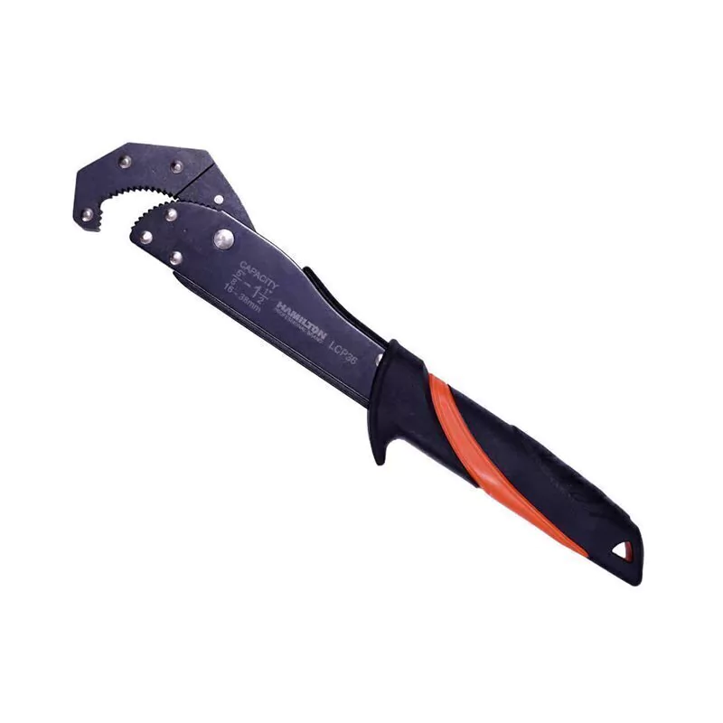 Llave para caño autoajustable HamiltonSólida fabricación.– Ajuste automático.– Mordazas de gran poder de sujeción, forjadas en Acero Cr-Molibdeno.– Capacidad: 16/38 mm. (5/8″ – 1 1/2″).– Mango ergonómico antideslizante de dos componentes.SKU: LCP36