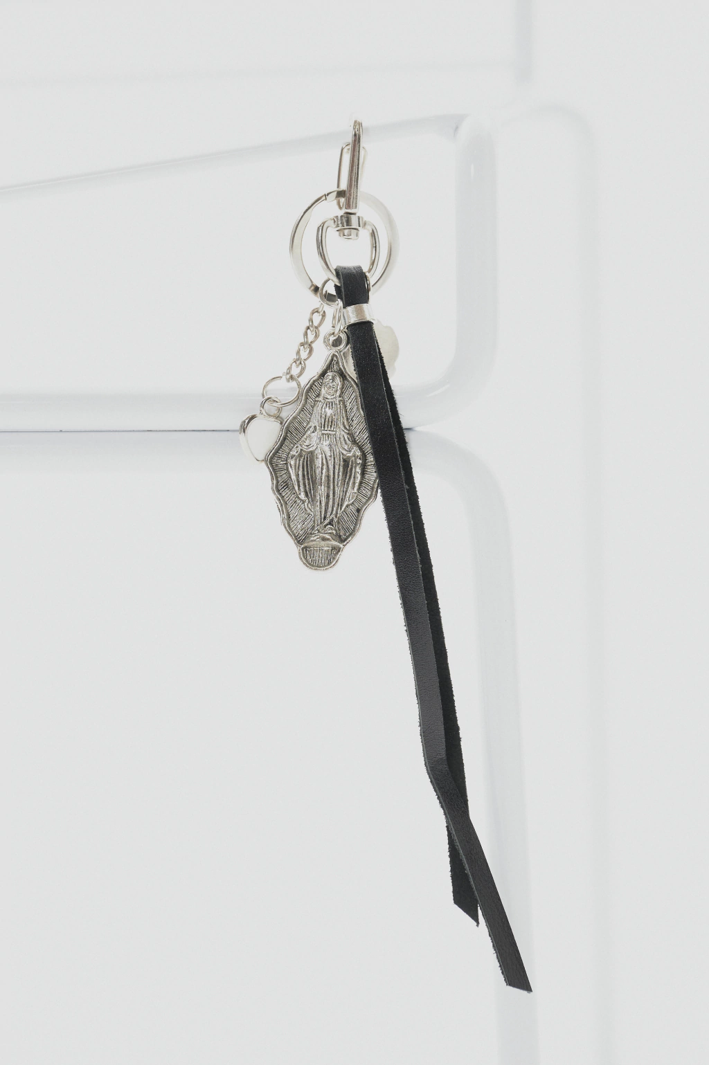 Llavero Virgen María con cadena níquel con medallas fundición. Tiene una tira de cuero con un pasante níquel.