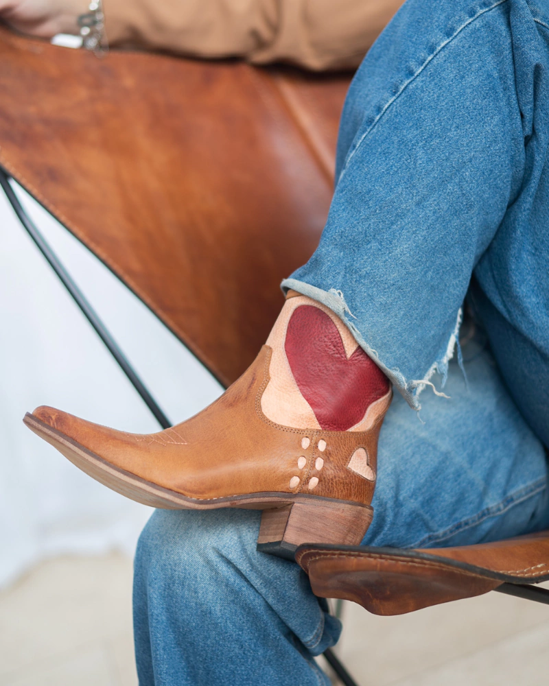 Texana en punta, 100% cuero vacuno color suela con detalles en rosas y bordo. Bordado a tono en los laterales y la punta. Taco de 5 cm de madera y caña de 18cm desde el talon. Súper comodas y divinas!