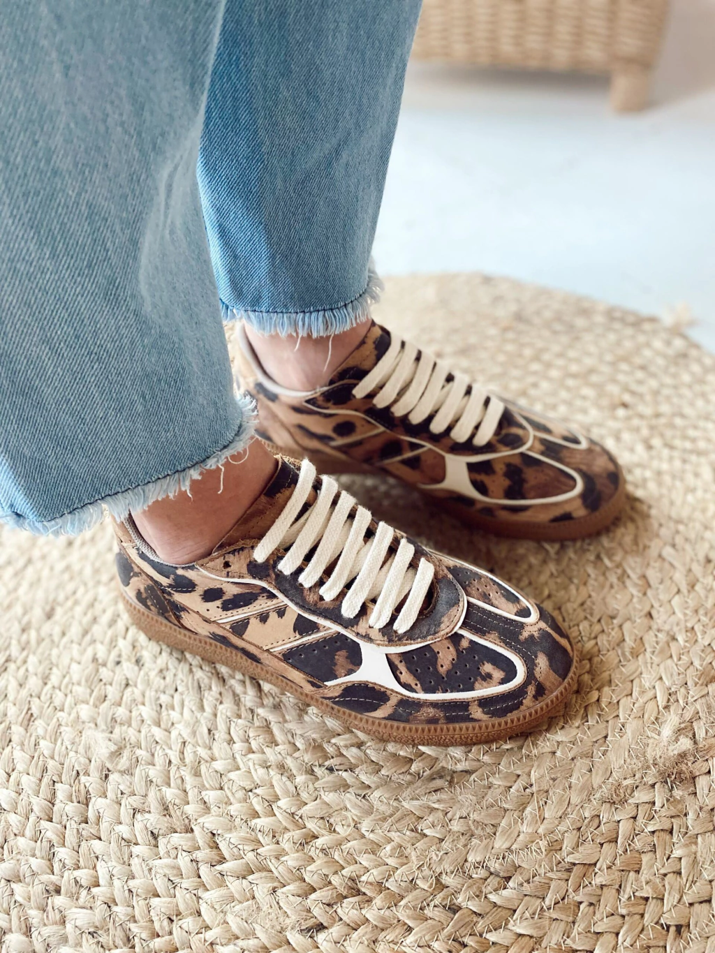 Material: cuero vacuno leopardo y en combinacion con detalles en cuero natural y cordones de algohodon del mismo tono.