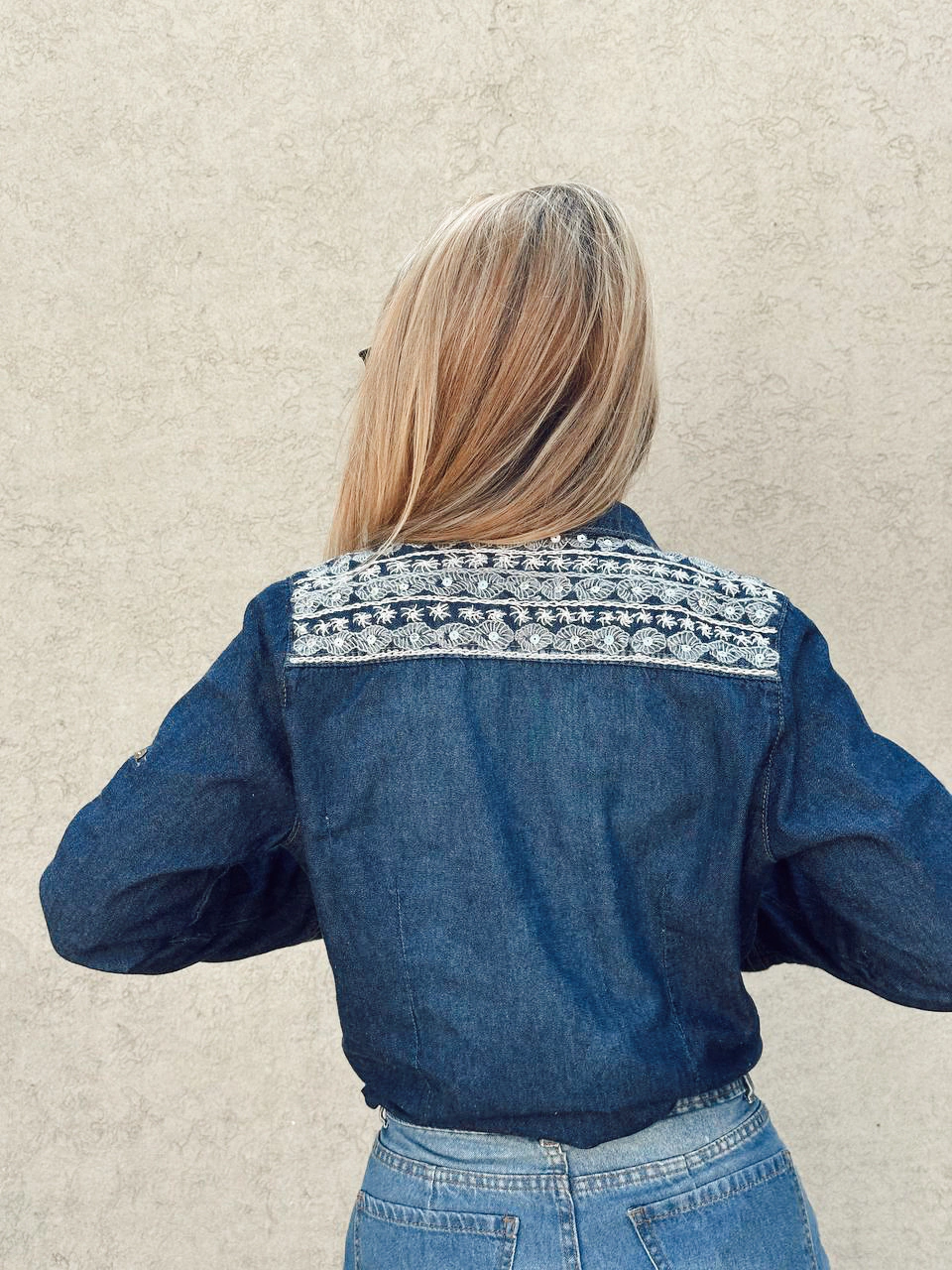 Camisa confeccionada en jean elastizado. Posee bordado realizado a mano con pedreria e hilos y guarda de la India en el frente y espalda.