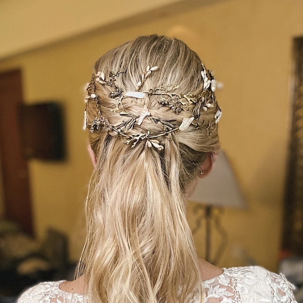 Fotos: Nico PannuzioMake up: Male AguilarAros ciprés y tocado trabajado en orgánicos de bronce, perlas de río asimétricas y puntitos de porcelana fría.