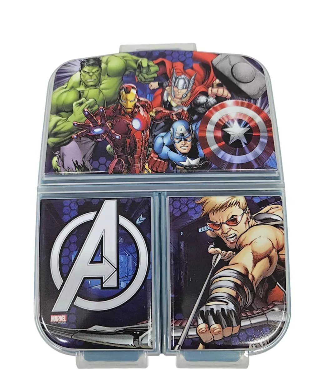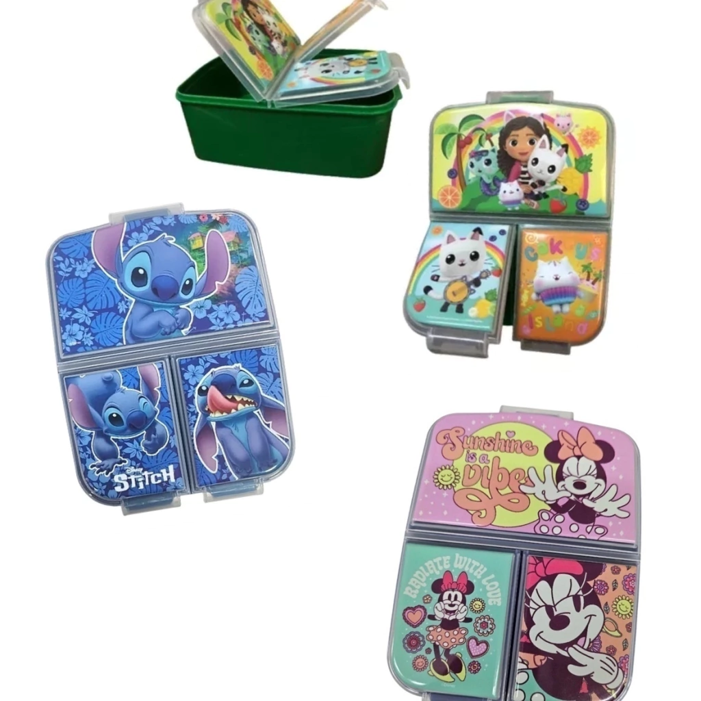 Lunchera con 3 divisiones.Libre BPA. Apto lavavajillas. Apto microondas sólo para calentar, no cocinar. Se aconseja calentar sin la tapa.Medidas : 18cm x 13,5cm x 5,5cm.No son herméticas. No aconsejables para llevar líquidos.Las fotos son ilustrativas, puede cambiar el color de la base de la lunchera.