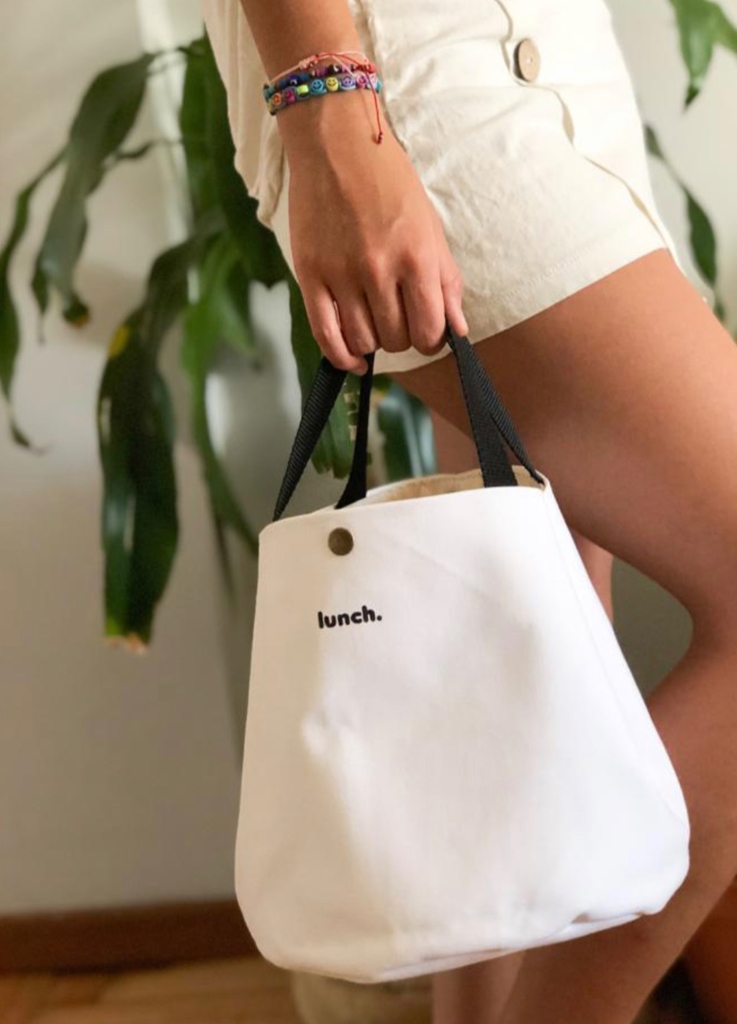 Diseñada para llevar viandas al trabajo,confeccionada en tela rígida.Cuenta con dos broches laterales y uno central.Medida abierto: 38 cm x 23 cm de alto.Base: 23 cm.