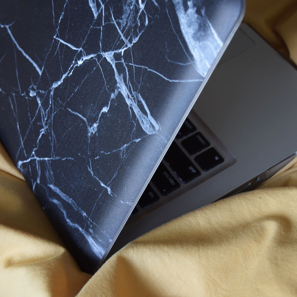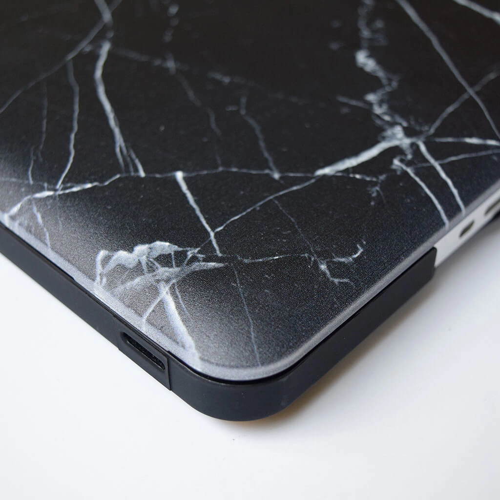Las fundas están diseñadas en dos piezas para colocar en la base y frente de tu MacBook. La pieza superior tiene un diseño impreso de mármol negro y la base es negra traslúcida con topes de goma antideslizantes. Ambas con terminación mate.