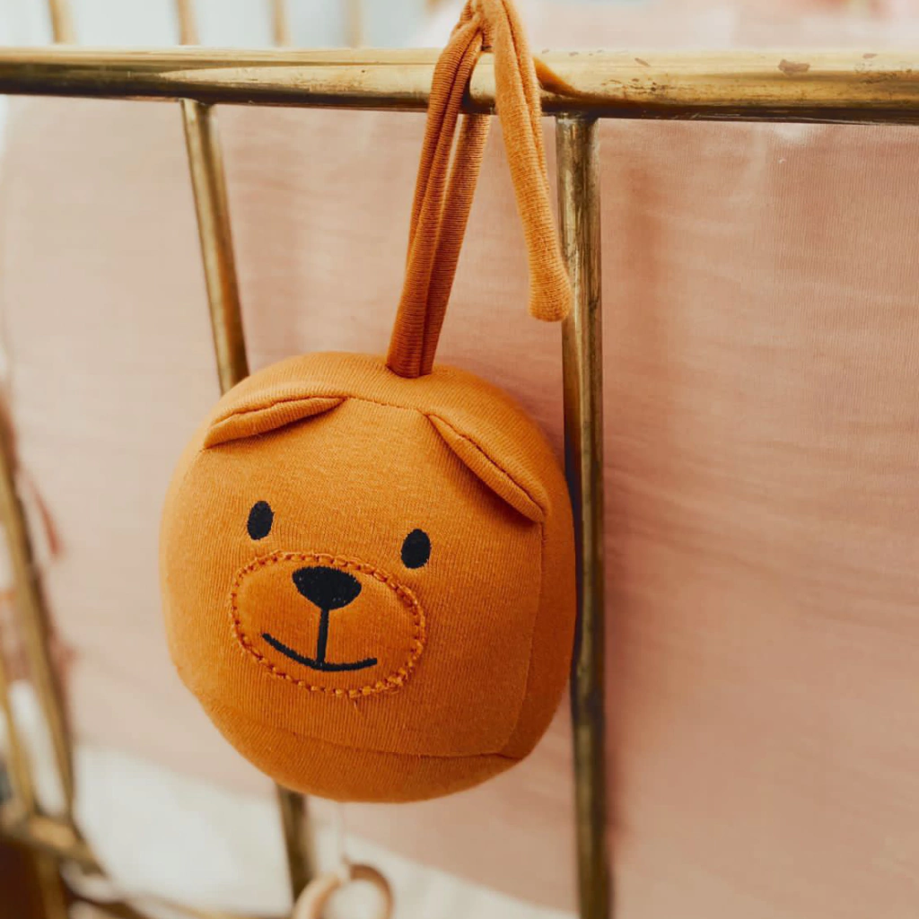 Móvil musical a cuerda, confeccionado en tela color ocre suave. Medida 10 cm x 15 cmMelodía Over The Rainbow