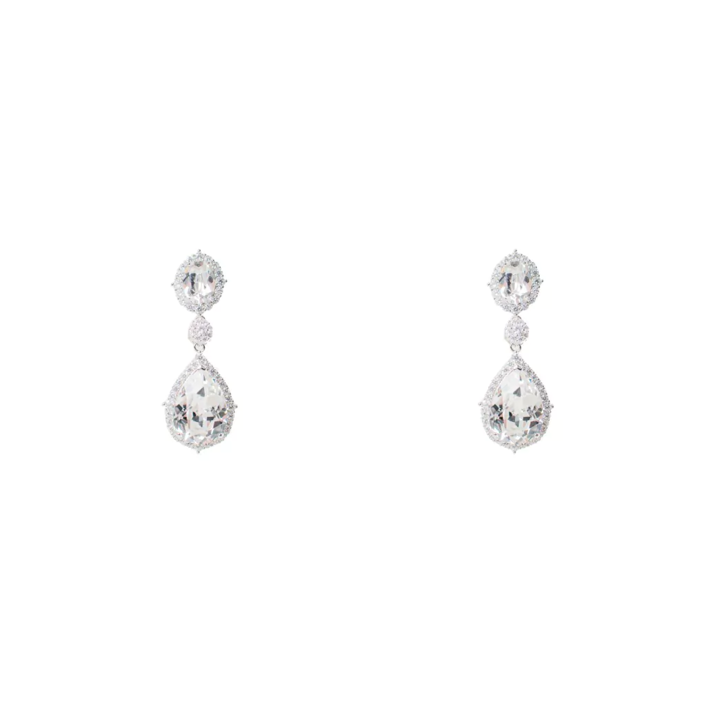 Confeccionado en base aleación de metal con baño de rodio con dos cristales Swarovski en forma de gota rodeados de Micro Pavé Swarovski.