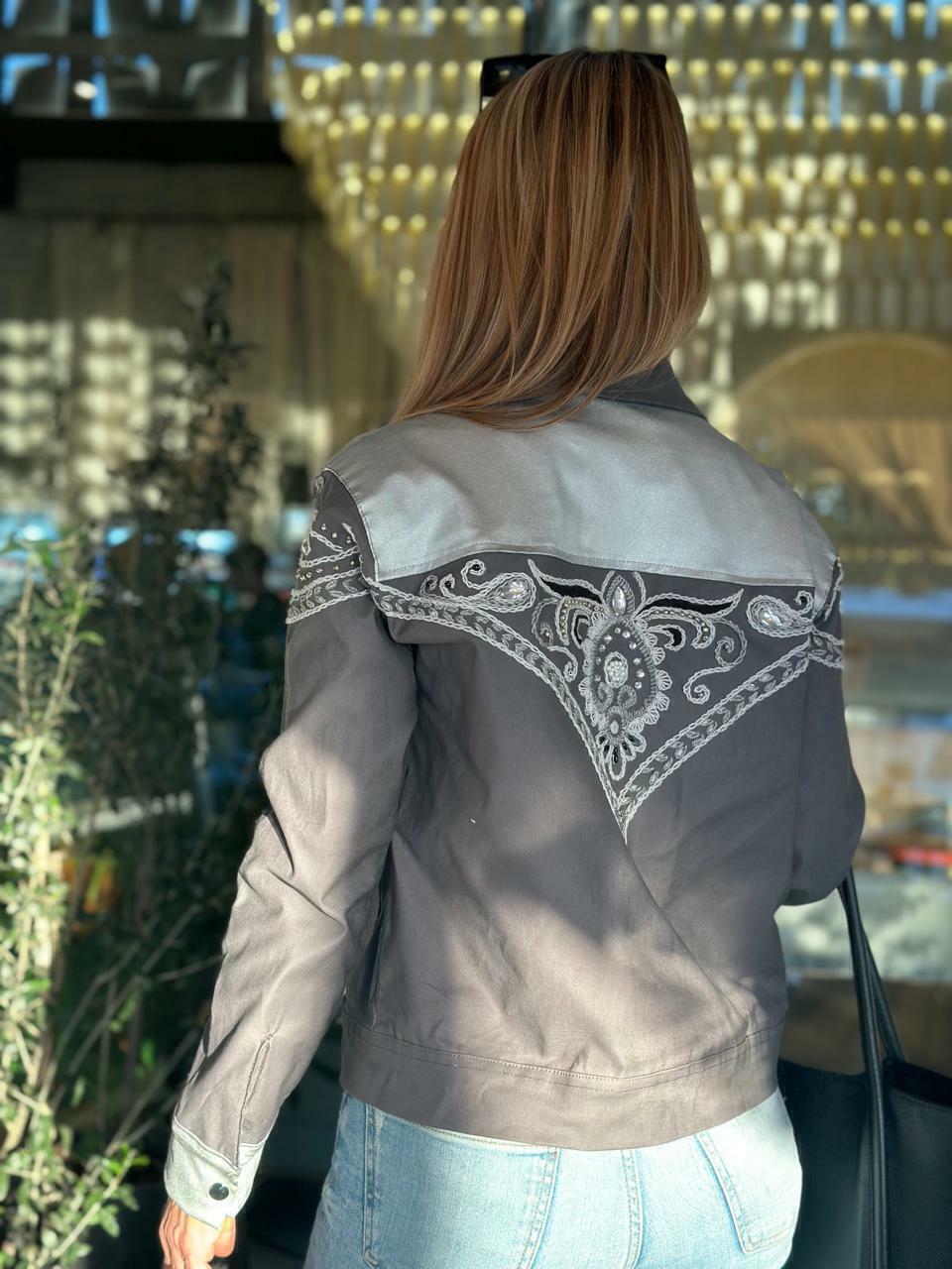 DETALLES DEL PRODUCTOChaqueta de gabardina elastizada gris combinada con bengalina plata , bordada a mano en tonos plateados en el trasero delantero y mangasCUIDADOSLavar a mano con jabón neutro y agua fria ( Temperatura máx40°c) | Lavar por separado | No escurrir ni dejar en remojo | No secar en máquina-secado en línea y a la sombra.