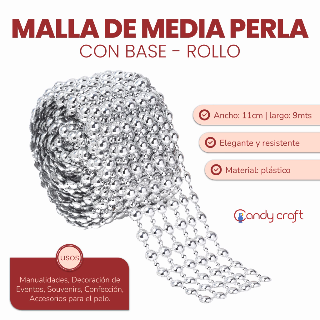 Medida Ancho: 11 cm. Largo: 9 metros. Media Perla combinada 12mm/6mm. 6 Lineas Horizontales. Material: Plástico Uso: Confección, Decoración, Souvenirs