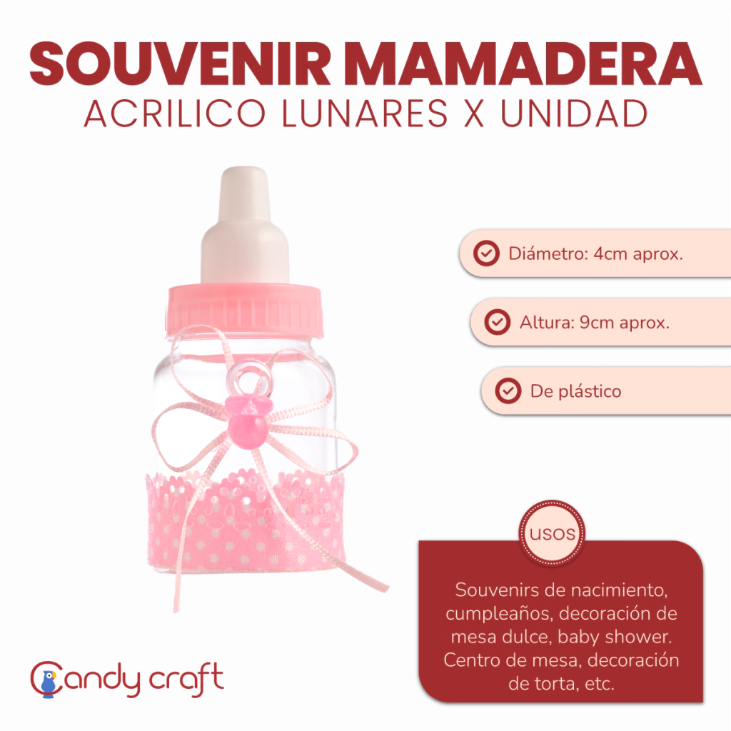 Medida Alto Total: 9 cm. Diámetro: 4 cm. Material:  Plástico Uso: Caramelera, Souvenir, Baby Shower.