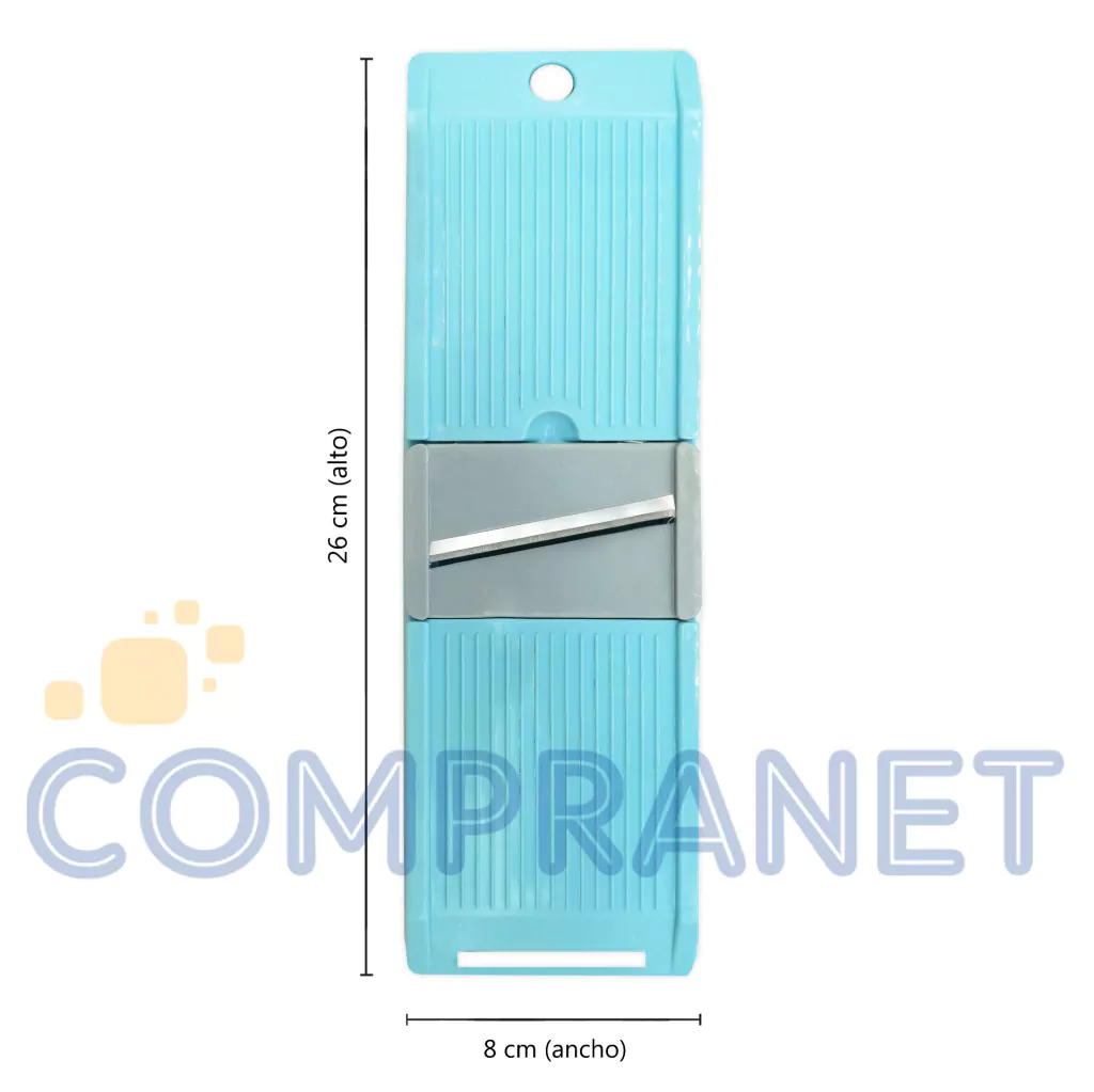 Mandolina Rallador, Cortador, 3 en 1. Súper practico en la cocina,es la manera perfecta de experimentar con diferentes tipos de verduras, texturas y sabores preparadas en tus platos.Incluye 3 cuchillas intercambiables: 2 tipos de cortes y la rebanadora ideal para papas, pepinos, zanahorias, etc. Fácil limpieza. Con perforado en la parte superior ideal para colgar.Material: Plástico y AluminioEn Blíster. Color: Celeste.Medidas: 26 cm (largo) x 8 cm (ancho)