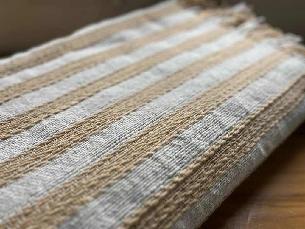 Manta de diseño de lana pesada tejida en telares artesanales - color crudo y yute, con flecos.