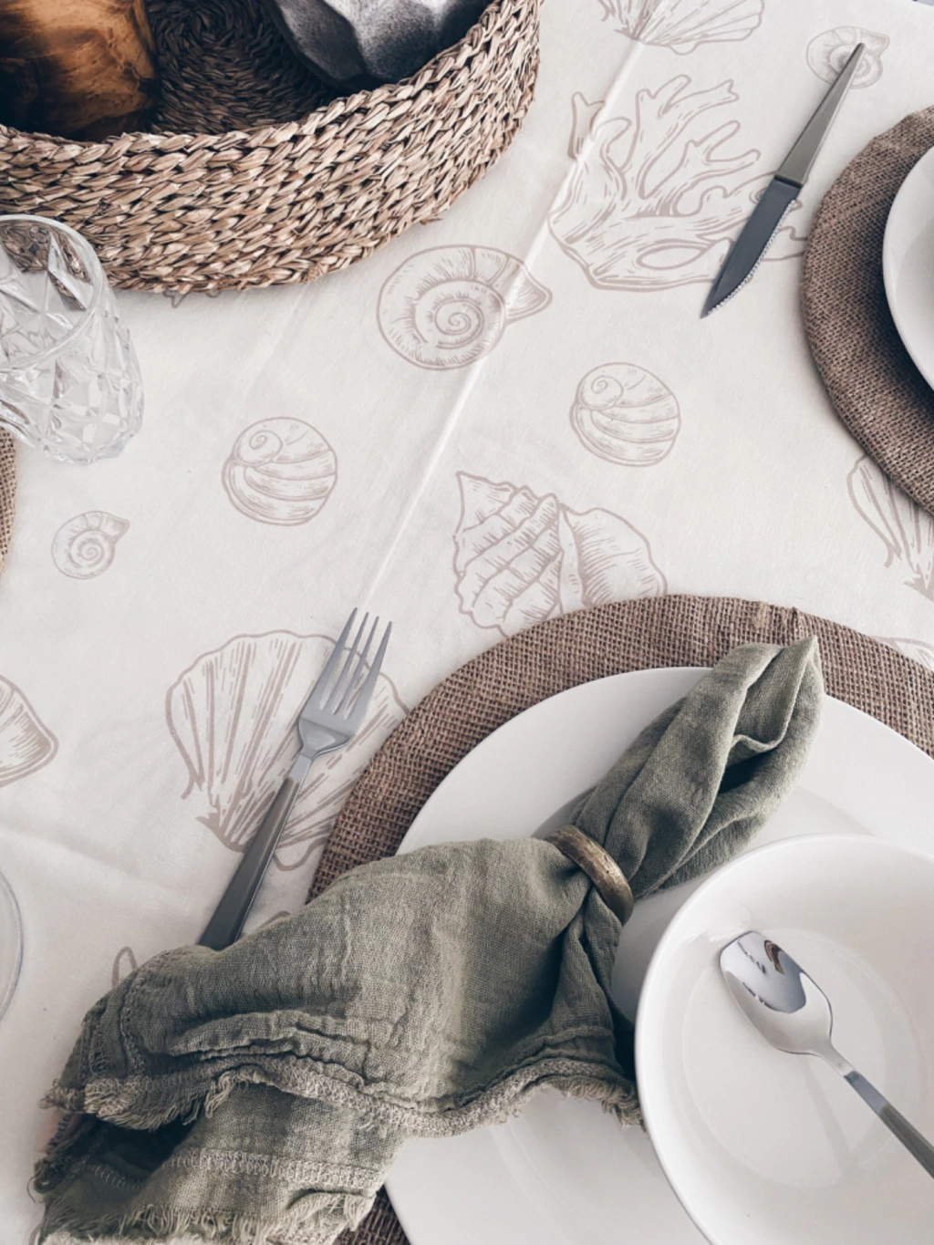 MANTEL DE LINO ESTAMPADO CON CARACOLES.MEDIDAS: 2.5 MTS X 1,70 MTS DE ANCHO.