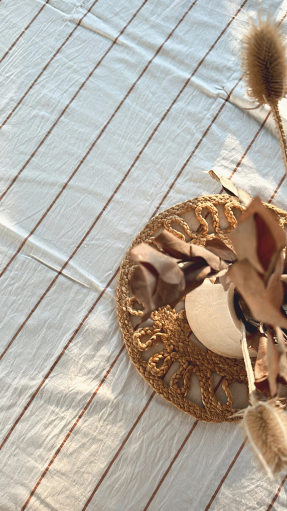 TUSSOR OFF WHITE CON LINEAS EN COLOR CANELA