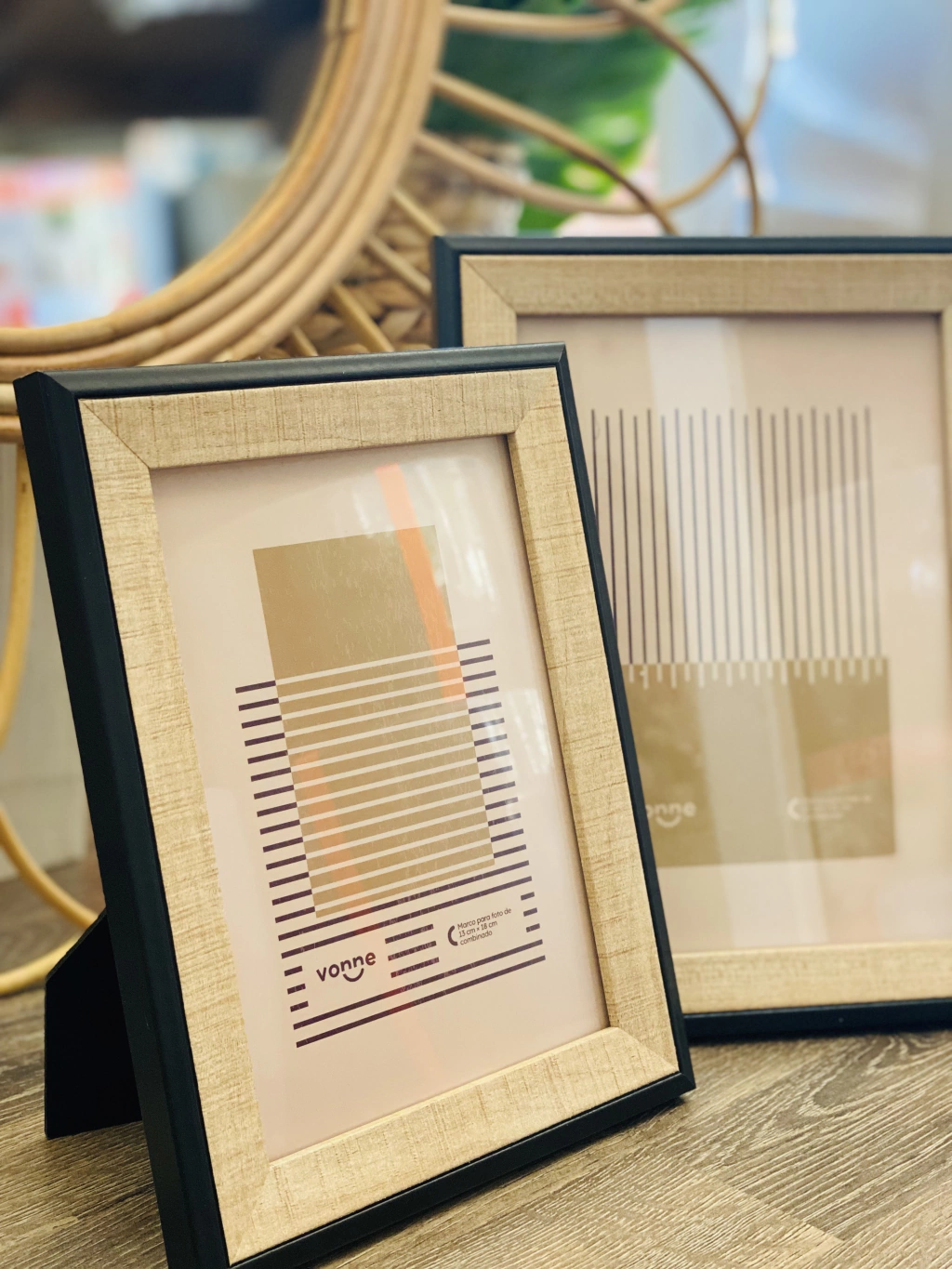 Elegante marco para fotos Inés con borde negro y detalle de imitación entelado. Perfecto para destacar tus fotos o ilustraciones con un diseño sofisticado. Disponible en dos medidas para adaptarse a diferentes espacios decorativos.