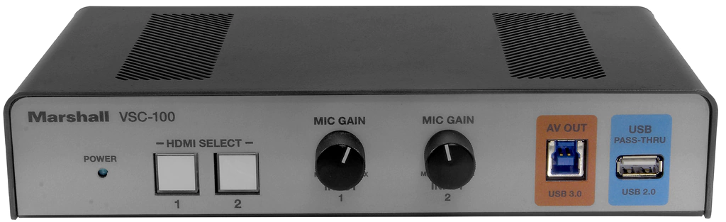 MARSHALL - VSC-100 - AV UCC Consolidator BridgeMARSHALL VSC-100 - Puente de consolidación AV UCCEl puente de consolidación Marshall VSC-100 AV UCC conecta fácilmente fuentes de audio profesional y video HDMI a una computadora para su uso en UCC, producción de video y grabación.El diseño plug-and-play fácil de usar junto con una interfaz de audio de alta fidelidad hace que la integración sea muy sencilla.Seleccione una de las dos fuentes de video HDMI con solo mover un interruptor. Las salidas de bucle activo mantienen las fuentes disponibles para otros fines, como la alimentación de monitores y grabadoras.Seleccione las fuentes de audio HDMI entrante o de audio analógico externo para las salidas HDMI y USB. Cualquiera de las fuentes también se puede seleccionar de forma independiente para la salida analógica, lo que permite monitorear una fuente mientras la otra pasa a una computadora o monitor.Caracteristicas• Dos entradas HDMI 2.0 seleccionables con salidas dobles activas en bucle• Controles de ganancia de audio independientes para fuentes de entrada de audio dual• El amplio rango de control de ganancia se adapta a micrófonos de salida baja hasta fuentes de nivel de línea• Interfaz de computadora USB 3.0 con control y escalado UVC• Funcionamiento plug-and-play sencillo. La instalación del controlador no es necesaria para la mayoría de las aplicaciones• El paquete incluye hardware de montaje para aplicaciones debajo de la mesa• Compatible con aplicaciones populares como Zoom, Skype, OBS Studio y más• Conversor A / B de HDMI a USB 3.0 con incrustadores de audio analógico dual de balance / desequilibrio de línea / micrófono• Funcionalidad UCC completa con control fácil de usarAplicaciones de Marshall VSC-100:El VSC-100 es adecuado para su uso en UCC, transmisión en vivo, transmisión y flujos de trabajo AV profesionales que incluyen Podcasting, conferencias web, producción de video y captura de pantalla.MAS INFORMACION:http://www.marshall-usa.com/pdf/Marshall_VSC-100-manual.pGARANTÍA OFICIAL:1 AÑONUESTROS SERVICIOSMás de 35 años en el mercado.Líder de soluciones tecnológicas en Argentina.Contamos con servicio técnico y brindamos el mejor servicio postventa.Centro de reparación en nuestras oficinas.Ofrecemos Garantía en todos nuestros productos.Showroom en Ciudad Autónoma de Buenos Aires.
