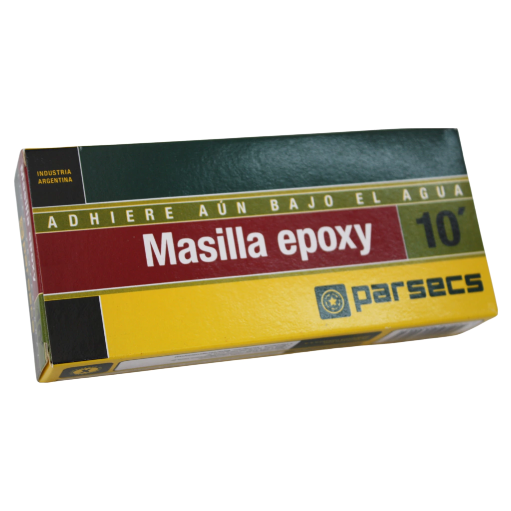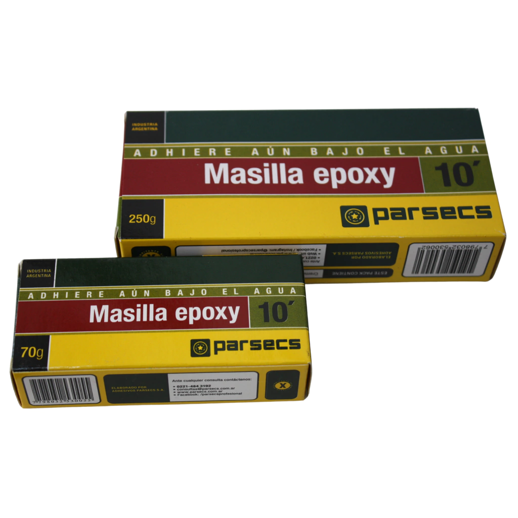 Características- Marca: PARSECS.- Linea: Masilla Epoxy 10 Minutos.- Estuche: 250g. - Terminacion: Rigida.- Color: Beige. - Densidad: 1.9 a 2.1 g/cm3.- Producto de 2 componentes en partes iguales. Relacion Mezcla 1:1.- Resistencia a Temperaturas -20° a 100°C.- Temperatura de Descomposicion 202°C.- Resistencia a la Traccion: 100kg/cm2.- Estabilidad dimens.: No produce cambio de vol. durante fraguado.- Tiempo abierto de trabajo: 4 a 5 minutos.- Tiempo de endurecimiento: 10 Minutos.- Tiempo de puesta en servicio: 1 Hora. (Maxima Resistencia 24hs)- Apto utilizacion en Seco y Bajo el Agua.- Utilidades: rellenar base inodoro y bidet.- Utilidades: cañerias pinchadas, mochilas sanitarias rajadas.- Utilidades: imperfecciones en maderas, tanques de combustible.- Utilidades: recountruir, rellenar y unir piezas, radioadores pinchados.- Adhiere sobre: hierro, acero inoxidable, aluminio, azulejos.- Adhiere sobre: madera, vidrio, hormigon, granito.- Adhiere sobre: plomo, cobre, bronce, marmoles.