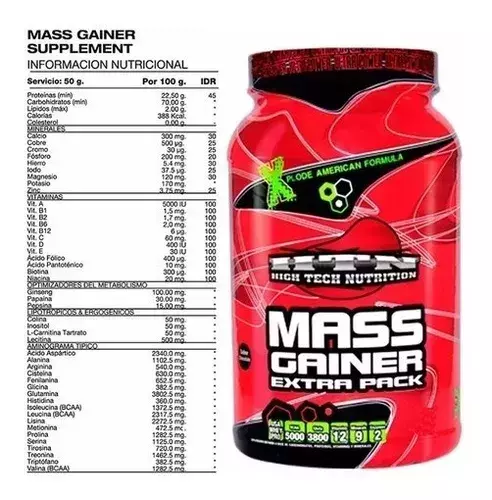 MASS GAINER EXTRA PACK• Desarrollo de masa muscular• Recuperación de Nutrientes• Nutrición BalanceadaMASS GAINER EXTRA PACK es un suplemento natural diseñado para aumentar de peso y desarrollar rápidamente la masa muscular, aportando calorías sin grasas inútiles.Aporta además fuerza y energía al organismo. Formulado a base de más de 30 nutrientes, es considerado el refuerzo nutricional ideal para todo deportista de alto rendimiento.HTN. Un escalón más arribaMass Gainer Extra Pack HTN® es otro producto exclusivo de HTN®. Está elaborado con una fórmula sinérgica que combina ingredientes que potencian el resultado.Aporta carbohidratos de rápida, mediana y lenta absorción para ser asimilados por nuestro organismo en tiempos consecutivos y brindar así energía progresiva durante los entrenamientos. Aporta una elevada cantidad de proteínas concentradas de suero al 80%, importadas desde USA, con la más alta biodisponibilidad. balanceado perfil de aminoácidos.Glutamina, BCAA (L-Leucina, L-Isoleucina, L-Valina), entre otros. 12 vitaminas (cobertura 100% IDR) y 9 minerales (25 al 30% IDR).Ginseng como optimizador del metabolismo, L-Carnitina Tartrate y otros lipotrópicos que sirven como fuente de energía y permiten desarrollar la masa muscular, quemando las grasas depositadas y tonificando el cuerpo.MODO DE USO:DÍAS DE ENTRENAMIENTO: (2 medidas de 50 g c/u): la 1er medida 1 hora antes de entrenar. La 2da medida apenas finalizado el ejercicio, preferentemente dentro de los 30 minutos. Se puede mezclar con agua o con leche descremada.DÍAS DE DESCANSO: (1 o 2 medidas de 50 g c/u): tomar las medidas alejadas entre sí y lejos de las comidas. Por ejemplo una a media mañana y otra a la tarde.