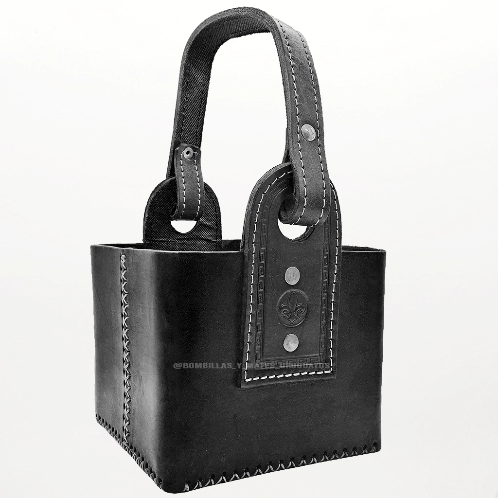 Matera canasta de cuero 20x20 con division con manija de cuero.