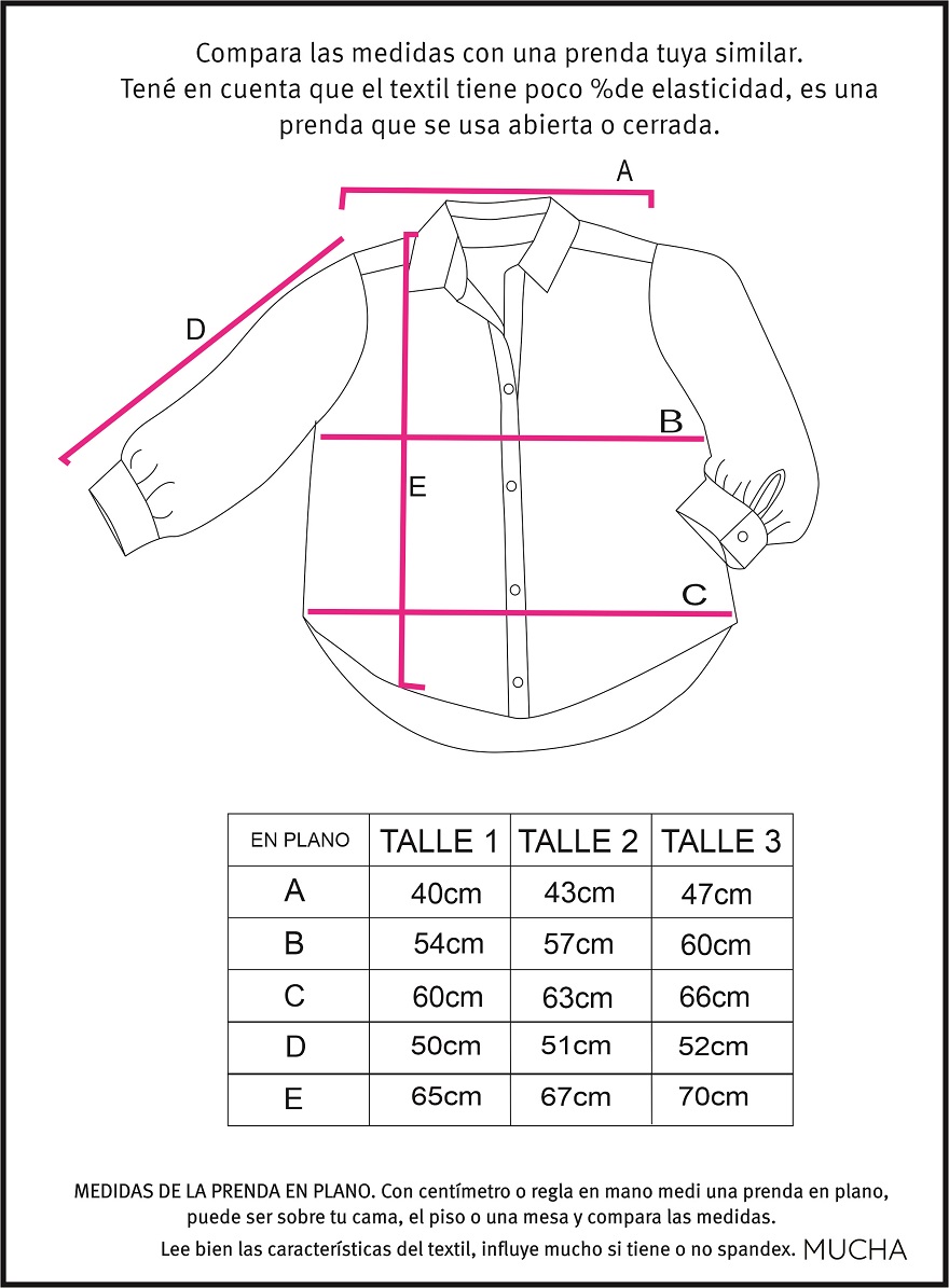 Medidas de LA PRENDA, el textil tiene un % de spandex, chequea el ancho de espalda y contorno de busto para asegurarte que te quede perfecta.