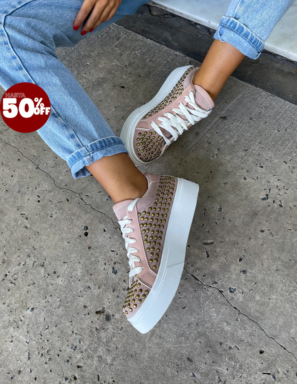 Zapatillas de cuero vegano color nude con tachas.Material: Cuero veganoAltura de la base: 3 cmHorma: NormalLa tabla de talles corresponde a la medida del pie.Si la horma es normal, sugerimos llevar tu talle habitual.Si la horma es chica, recomendamos llevar un talle más.Si la horma es grande, recomendamos llevar un talle menos.TABLA DE MEDIDAS:Talle 35: 23 CmTalle 36: 23,5 CmTalle 37: 24 CmTalle 38: 25 CmTalle 39: 25,5 CmTalle 40: 26 CmMuy importante!!! Para la confección de los zapatos se utilizan cueros y cueros sintéticos seleccionados de alta calidad. Al ser únicos y naturales, pueden presentar alteraciones en el tono, marcas, arrugas o pliegues. Dichas características no se consideran como imperfecciones ya que son manifestaciones propias del material.