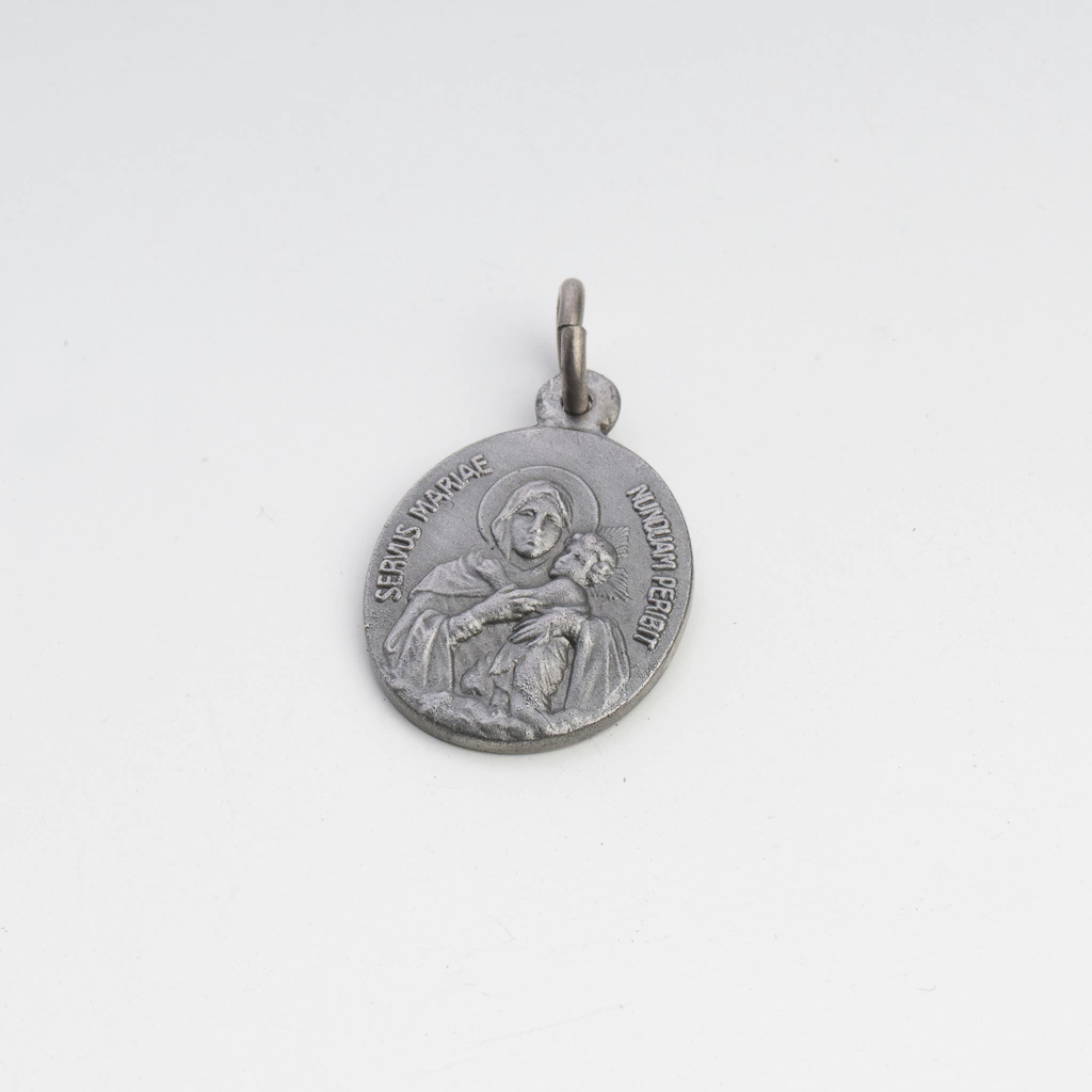 Medalla en alpaca simple, con imagen de la Virgen de Schoenstatt.Dimensiones: 22 mm.