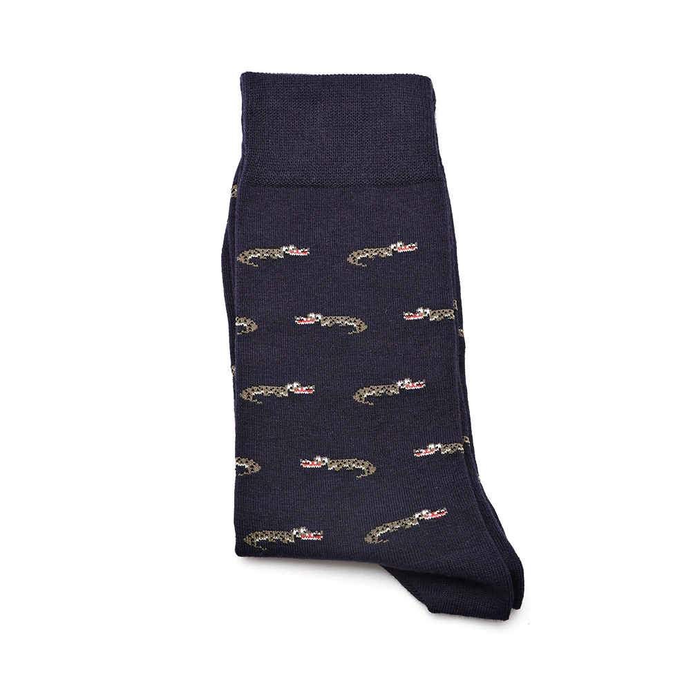 1 par de medias de algodón con puño confeccionada con un 85% de hilo de algodón con un 15% de fibra de poliamida. El puño viene con elastano para poder ajustarse correctamente a la pierna. Tiene diseño de cocodrilos sobre fondo azul.