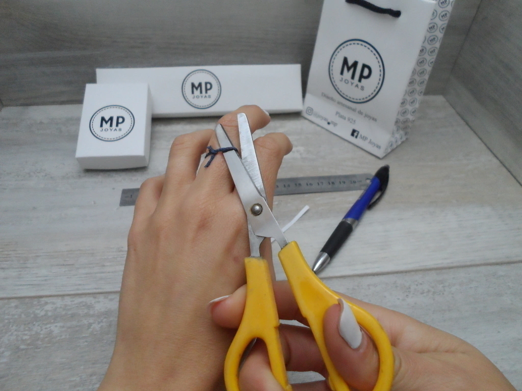 1- Tomá un hilo, lo atas a tu dedo, que te quede cómodo, ni flojo ni apretado; le haces un nudo y lo cortas. Lo extendes sobre la regla y nos decis los mm. La medición debe ser muy precisa, ya que cada mm es un numero distinto y cambia la medida.
