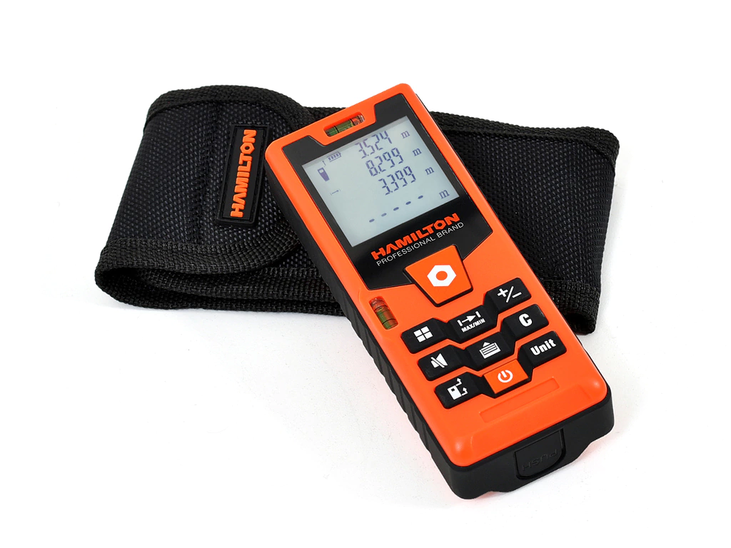 Medidor de distancia láser HamiltonSólida contrucción.– Distancia máx.: 40 m.– Realiza mediciones de tipo lineales, volumétricas y pitagóricas.– Unidades de medida: metros / pulgadas / pies.– Pantalla LCD retroiluminada.– Gabinete IP54 a prueba de agua y polvo.– Utiliza 2 pilas AAA 1,5V (no incluidas)– Tipo de láser: 620nm-690nm <1MW. - Precisión: +/- 2 mm.SKU: MD40