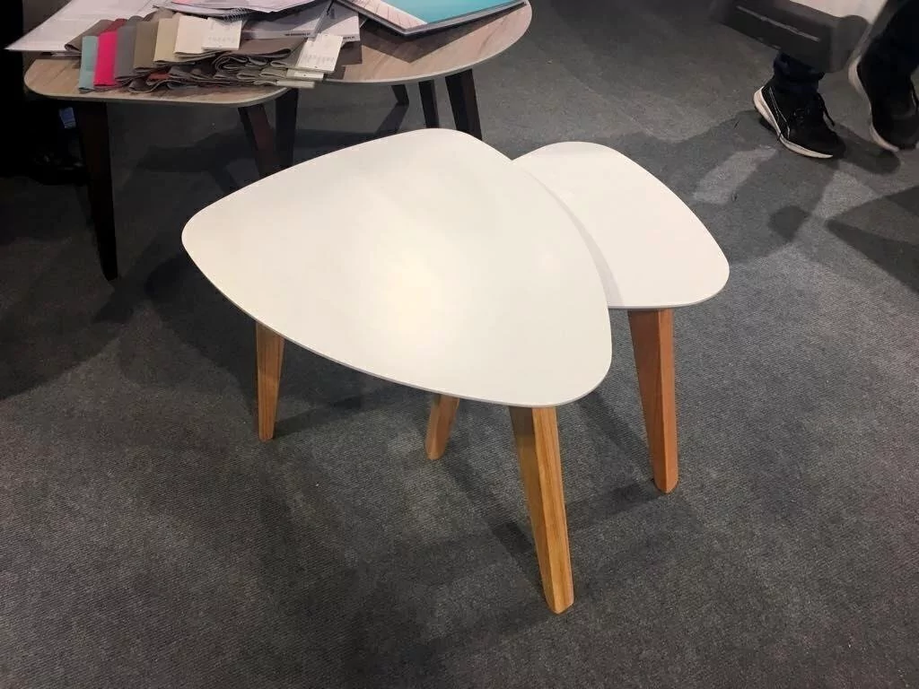 Conjunto de Mesas Triangulares - Elegancia y Versatilidad para Tu HogarDescubre elConjunto de Mesas Triangulares, una combinación única de diseño y funcionalidad que transformará cualquier espacio. Este elegante set incluye dos mesas de formas geométricas distintivas, perfectas para añadir un toque moderno y funcional a tu decoración.Características Principales:Composición del Conjunto:El set incluyedos mesascon formas triangulares que aportan un diseño innovador y atractivo:Mesa Triangular Grande:Con dimensiones de60 x 45 cm, ideal para utilizar como mesa auxiliar.Mesa Triangular Pequeña:Con40 cm de lado, perfecta para completar el conjunto o usar como acento en espacios reducidos.Materiales de Alta Calidad:Patas en Madera Maciza de Paraíso:Disponibles en los sofisticados coloresparaíso naturalotabaco, brindando estabilidad y un acabado elegante.Tapa en MDF:Duradera y resistente, con opciones de acabado personalizables para adaptarse a tu estilo.Opciones de Acabado:Laminada en Color Barrique/Baltic:Con cantos laqueados en blanco, para un look moderno y luminoso o Laqueada en Color Blanco: Con cantos laqueados en gris, añadiendo un toque contemporáneo y sofisticado.Beneficios Clave:Diseño Geométrico Único:Las mesas triangulares ofrecen una estética moderna y fresca, ideal para añadir interés visual y funcionalidad a tu espacio.Opciones de Personalización:Elige entre las opciones de acabados disponibles para combinar perfectamente con tu decoración y crear un ambiente estilizado.Versatilidad en el Uso:Perfectas para diferentes aplicaciones, desde mesas auxiliares en la sala de estar hasta mesas de apoyo en oficinas o habitaciones, adaptándose a tus necesidades de espacio y estilo.Durabilidad y Estilo:La combinación demadera maciza de paraísoyMDF de alta calidadgarantiza una mesa robusta y resistente, mientras que los acabados elegantes proporcionan una apariencia sofisticada.Redefine tu espaciocon elConjunto de Mesas Triangularesy disfruta de una fusión perfecta de diseño moderno, funcionalidad y durabilidad.Punto venta Oficial: La valenziana muebles