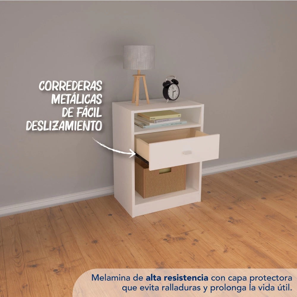 Mesa de luz de líneas clásicas, completamente funcional y versátil para que puedas utilizar los espacios de guardado como más te guste.