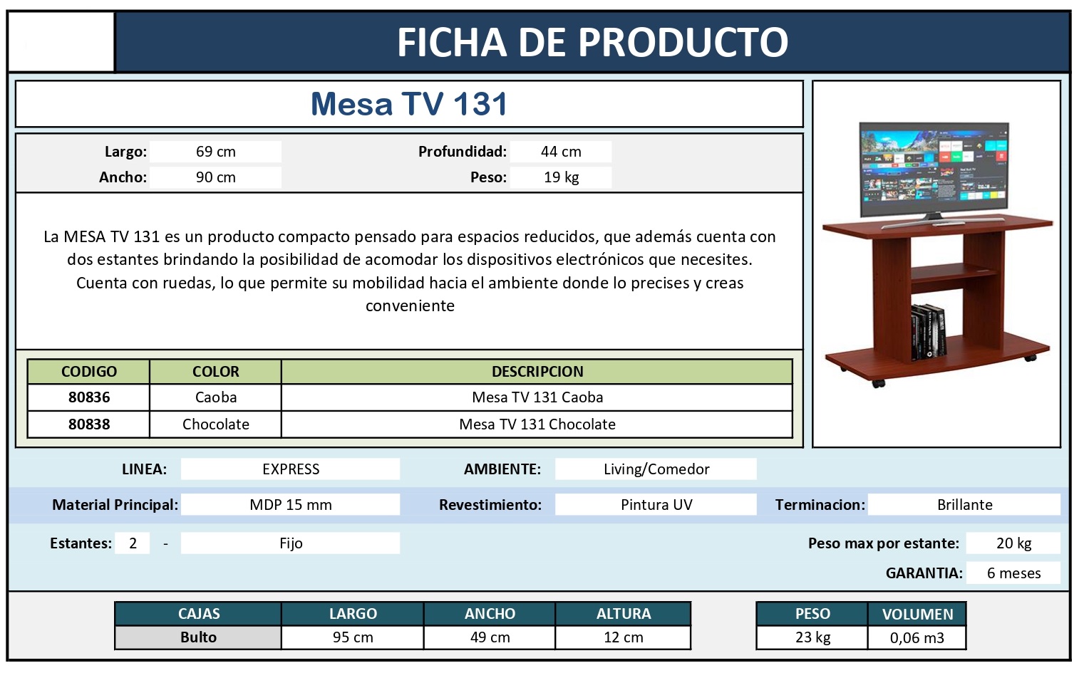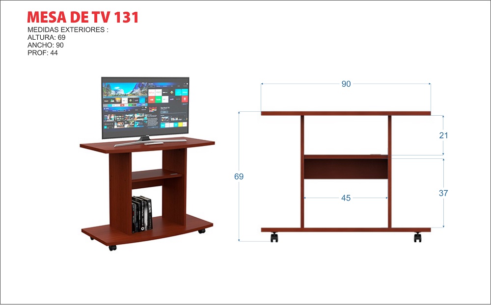 La MESA TV 131 es un producto compacto pensado para espacios reducidos, que además cuenta con dos estantes brindando la posibilidad de acomodar los dispositivos electrónicos que necesites. Cuenta con ruedas, lo que permite su mobilidad hacia el ambiente donde lo precises y creas conveniente