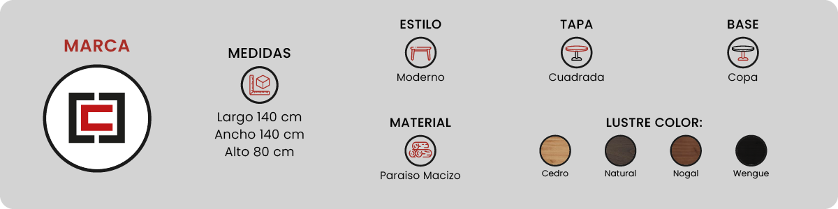 El beneficio a destacar de este modelo es su base central en forma de copa que ofrece un soporte elemental a toda la estructura. Su tapa tiene detalles en todos los laterales de terminación a 45º y está completamente realizada con madera maciza. Gracias a sus dimensiones se puede aprovechar perfectamente el espacio para compartir con 8 personas cómodamente.