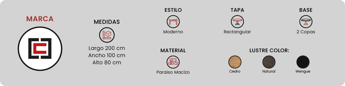Destacamos como principal ventaja su base central doble con forma de copa, la cual proporciona un soporte fundamental a toda la estructura. La tapa presenta detalles de terminación a 45 grados en todos los lados y está íntegramente elaborada con madera maciza. Sus dimensiones permiten aprovechar eficientemente el espacio, ofreciendo comodidad para que hasta 8 personas compartan momentos de manera confortable.