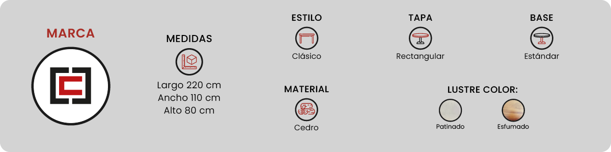 Una mesa ideal para crear espacios de buen gusto y sofisticación. Su estilo clásico se adapta fácilmente creando un entorno armonioso. Hecho de madera de Cedro y lustre esfumado; presenta los extremos en tonos más oscuros qué el centro de cada pieza. El espacio se optimiza gracias a sus dimensiones de hasta 2,40 mts, brindando la comodidad ideal para compartir un momento con hasta 8 personas.