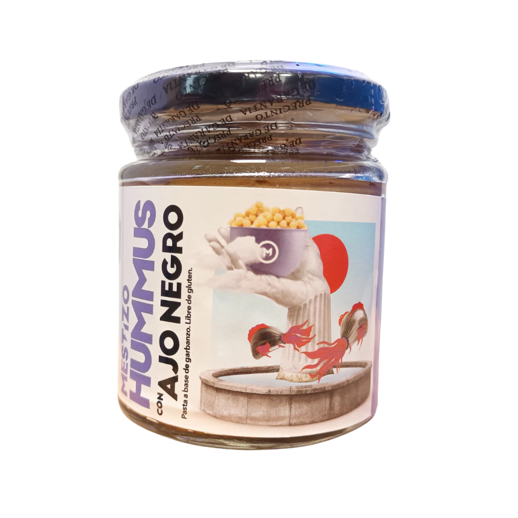 Ingredientes: garbanzo, agua, aceite de oliva, tahini, jugo de limón, ajo negro, sal. Acidulante: ácido tartático.