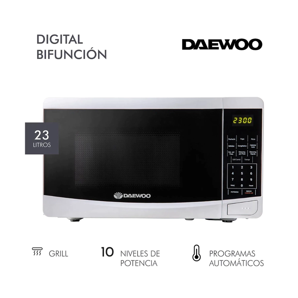 Ficha TécnicaCapacidad23 litrosTipo de ProductoMicroondas BifunciónModeloD223DGPotencia800wEspecificacionesNiveles de Potencia10Niveles de Descongelamiento1Plato GiratorioSíControlDigitalConvecciónNoCavidad InferiorPintadaColorBlancoTraba para NiñosSíDimensiones y PesosDimensionesAlto: 27,80 cm Ancho: 48,30 cm Profundidad: 36,90 cmPeso11,60 kg