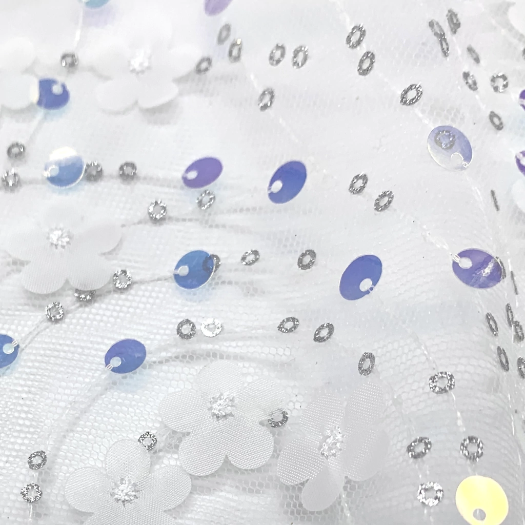 Textura: Fina y transparente, con aplicaciones de flores en relieve y lentejuelas tornasoladas.