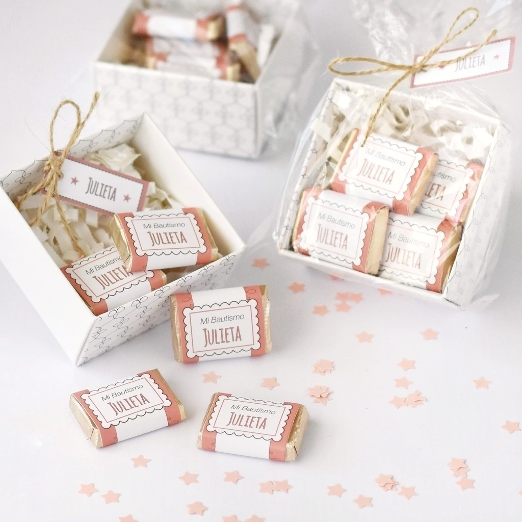 Cajita con 5 mini chocolates con leche.Personalizamos con nombre y leyenda cada choco.Chocolate sin taccMedida de la caja: 7cm x 6,5cmMedida de chocolate: 3cm x 2cmLo podemos hacer en el color que quieras