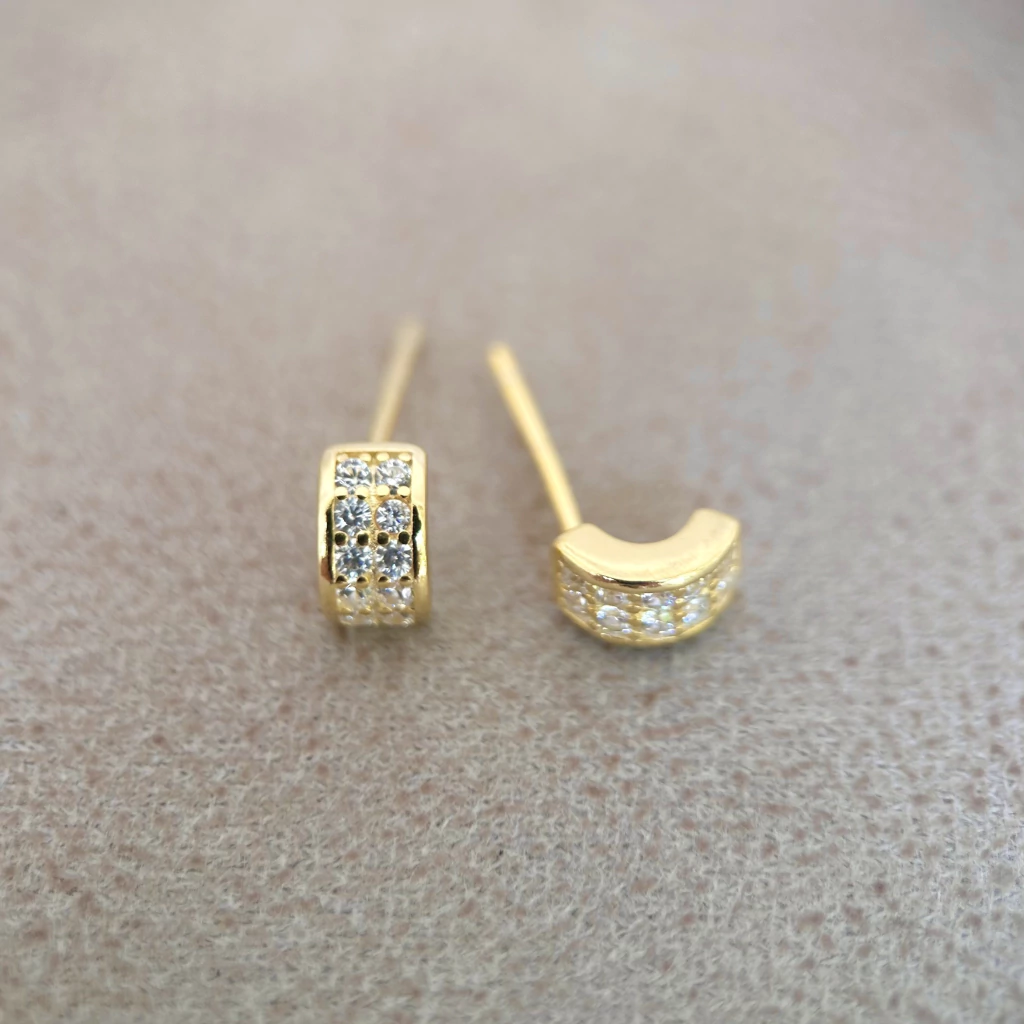 Aros miniatura de plata 925 con baño de oro gold 18k. Tienen una forma arqueada con microcubics color cristal en toda su parte frontal.Todos los productos de plata con baño de oro gold/rose requieren de mayores cuidados que aquellos que no estan bañados. En realidad, los cuidados son los mismos para ambos productos, pero la diferencia es que si no seguis estas recomendaciones con un producto de plata y este se ennegrece, vas a contar con diferentes métodos para limpiarlo, como por ejemplo el líquido o los paños limpiadores que encontras en nuestra tienda. En el caso de los productos bañados, no seguir las recomendaciones puede quitarle el baño al producto progresivamente y no pueden ser limpiados con los productos mencionados ya que el producto de limpieza sólo logrará quitarle el baño de oro.Enviamos una cartilla con las recomendaciones de cuidados en todas las compras, pero también podés leerlas en la sección "Bases y Condiciones" en nuestro sitio web.