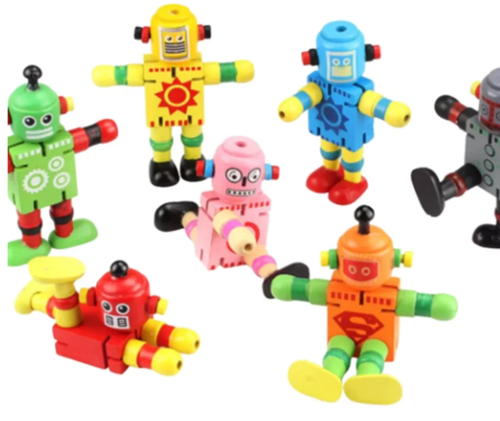 Robot de madera flexible. Se articula con los elásticos interiores que recorren sus partesSuper divertidos!Estimulan la motricidad fina, la concentración y la tolerancia a la frustaciónMiden 12 cms de alto.Colores variados