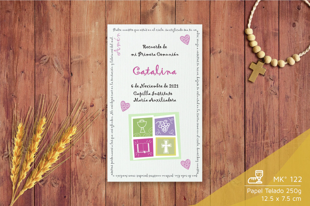 Estampas de Comunión Modelo C 452Pack x 25 unidadesFormato: 7.5 x 12.5 cmPapel Telado 250gImpresion Color*El precio incluye personalización de texto.