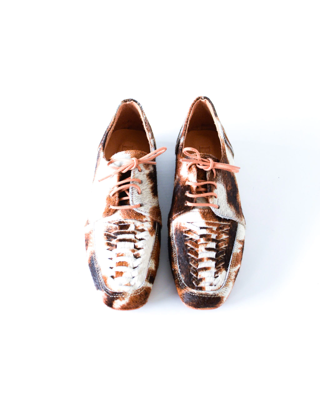 Mocasines confeccionados en 100% cuero vacuno pelo tipo vaca con manchas blancas y marrones. .