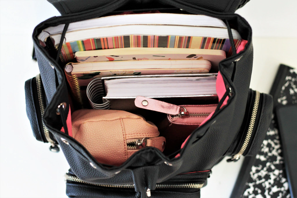 Mochila de ecocueroMedidas 30cm de ancho x 15cm de profundidad y 31cm de altoPara cuadernos a45 bolsillos externos en total. Dos en el frente, dos bolsillos laterales y un bolsillo en la espaldaForrada por dentro con un bolsillo internoHerrajes y detalles plateados