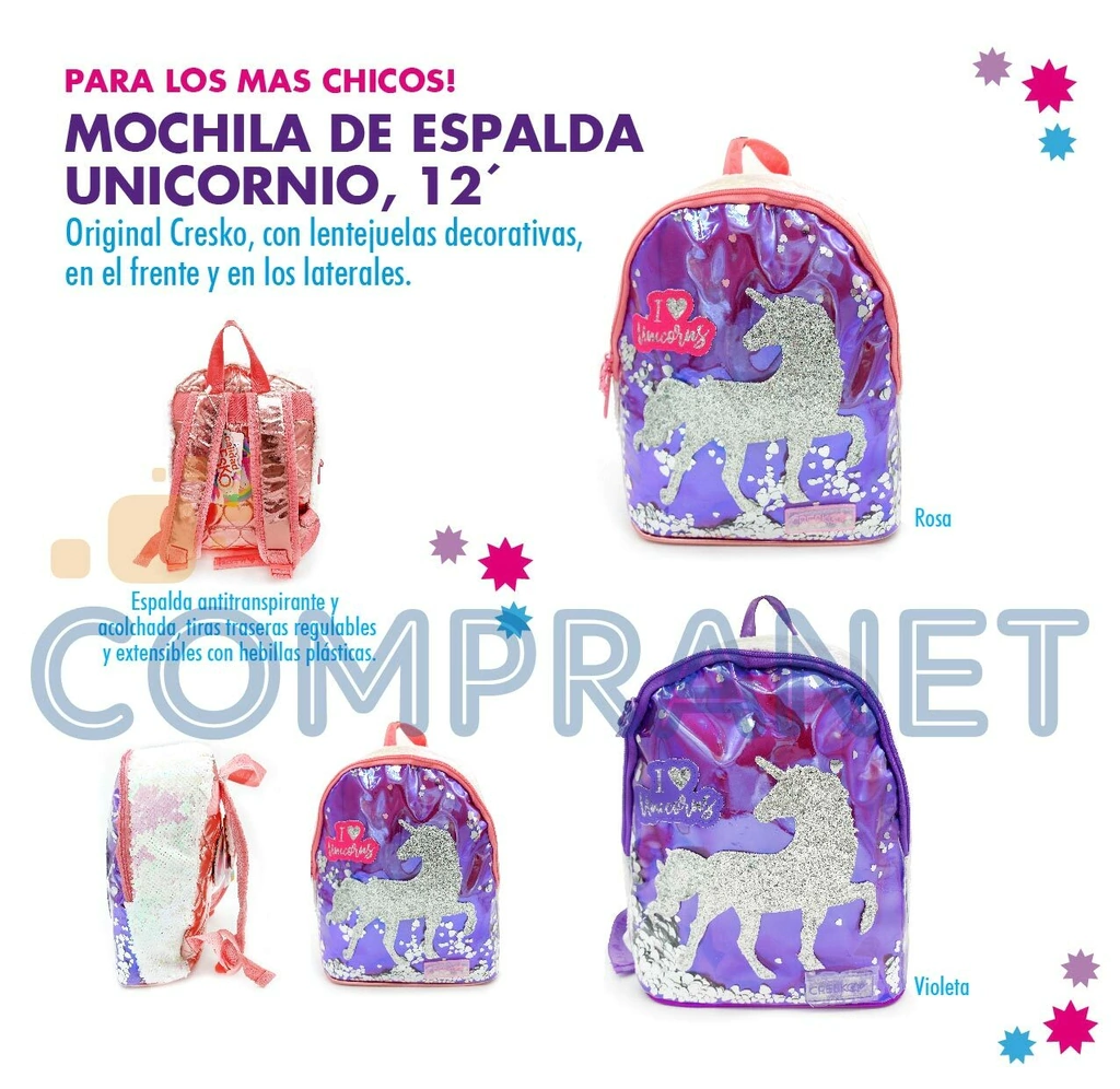 Mochila de espalda Unicornio 12´ con lentejuelas. Compartimento central con amplio espacio de guardado forrado en tela lisa. Cierre con deslizador metálico. Con figura de unicornio en el frente y lentejuelas decorativas móviles en el frente transparente.