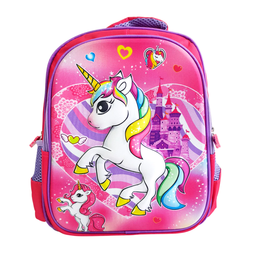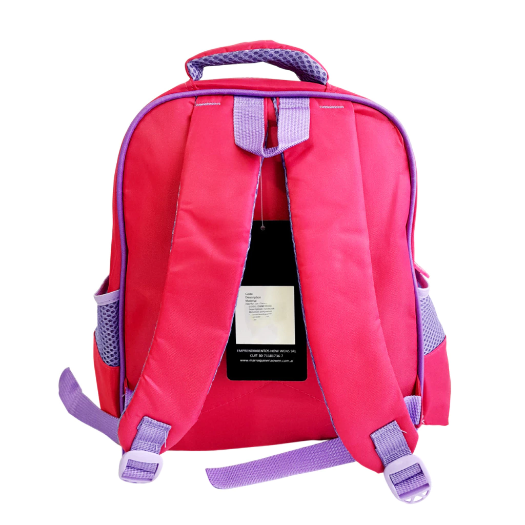 Mochila escolar 14 pulgadas de espalda, estampada con motivos varios infantiles.Posee 1 compartimento central espacioso, con cierre metálico y deslizadores de silicona decorativos, con 1 bolsillo frontal rígido 3D, con cierre y deslizadores de silicona decorativos.Interior forrado en tela lisa.Con 2 bolsillos laterales, de red con ajuste elástico (ideal para la botella).Tiras traseras antitranspirantes, regulables y extensibles con hebillas plásticas. Sujetador manual reforzado en la parte superior.Disponible en 6 modelos con estampas varias.Material: Poliéster.Medidas Mochila: 28 cm (ancho) x 35 cm (alto) x 12 cm (prof.).