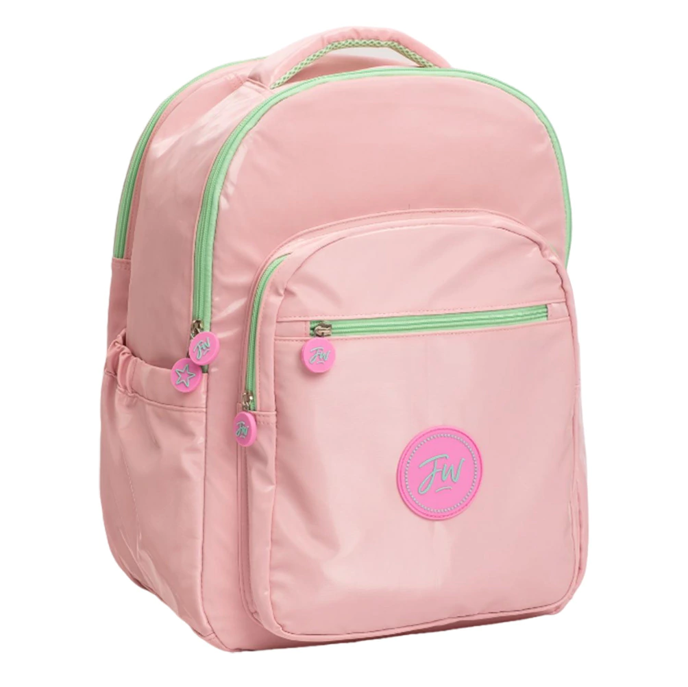 2 compartimentos principales, uno a la espalda con espacio para laptop , el otro de gran capacidad idea. 2 bolsillos frontales con bolsillos organizadores internos. . 2 bolsillos laterales ajustables para botella.Doble tirador de rubber con logo.Colores: plateado/dorado/rose gold/rosa brillosoMaterial:NYLONDimensiones: 44*32*23CM